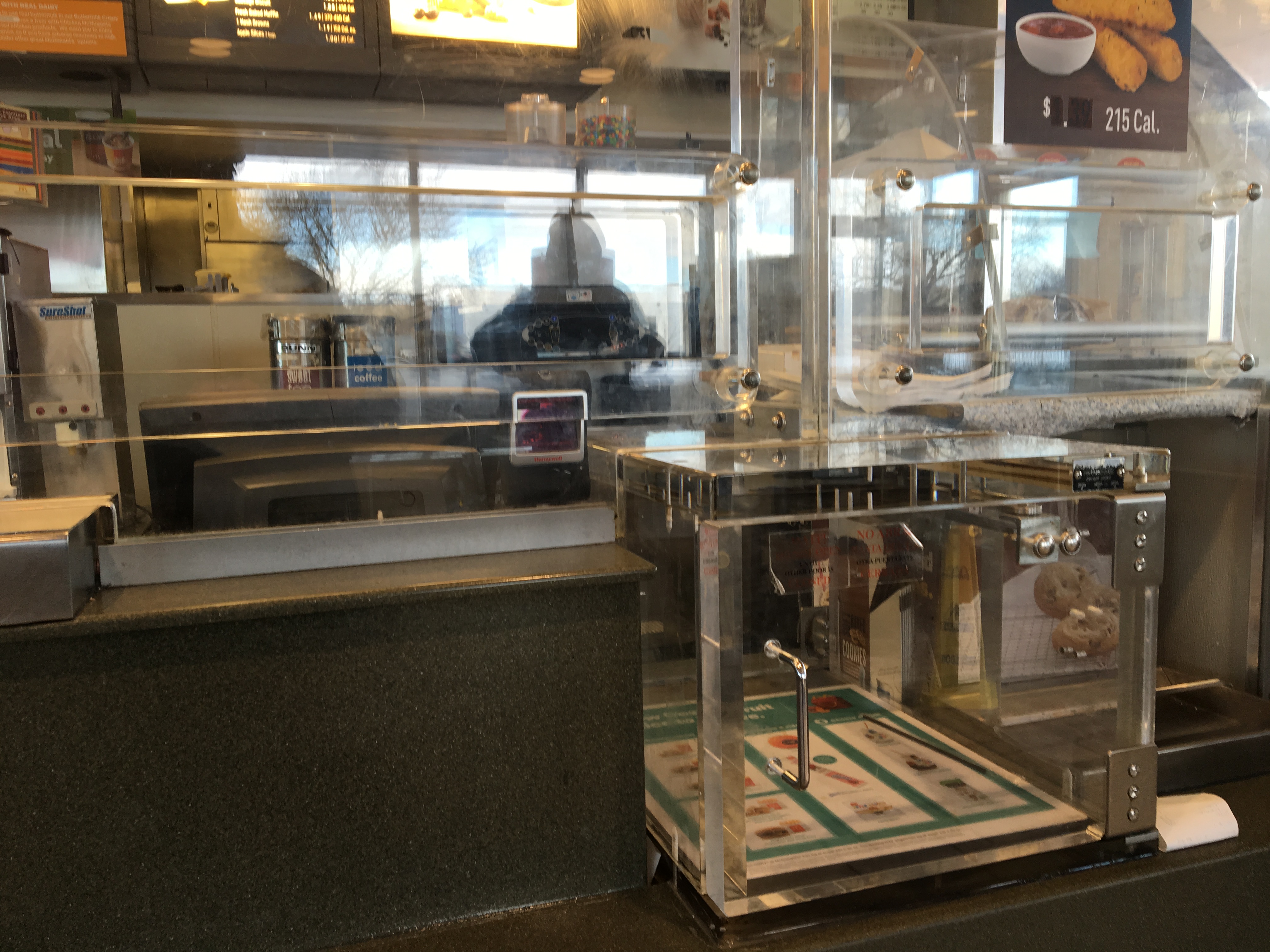 bulletproof glass. You receive your meal via a box made of the same material. A sign