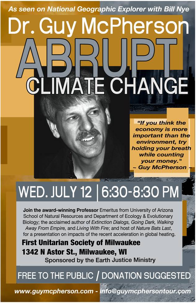 Subject: MILWAUKEE! (or Mequon, or Brookfield, or Hartland or . . . ) A Talk You Need to Hear. Dr. Guy McPherson: "Abrupt Climate Change" - Wed., July 12th 6:30 pm