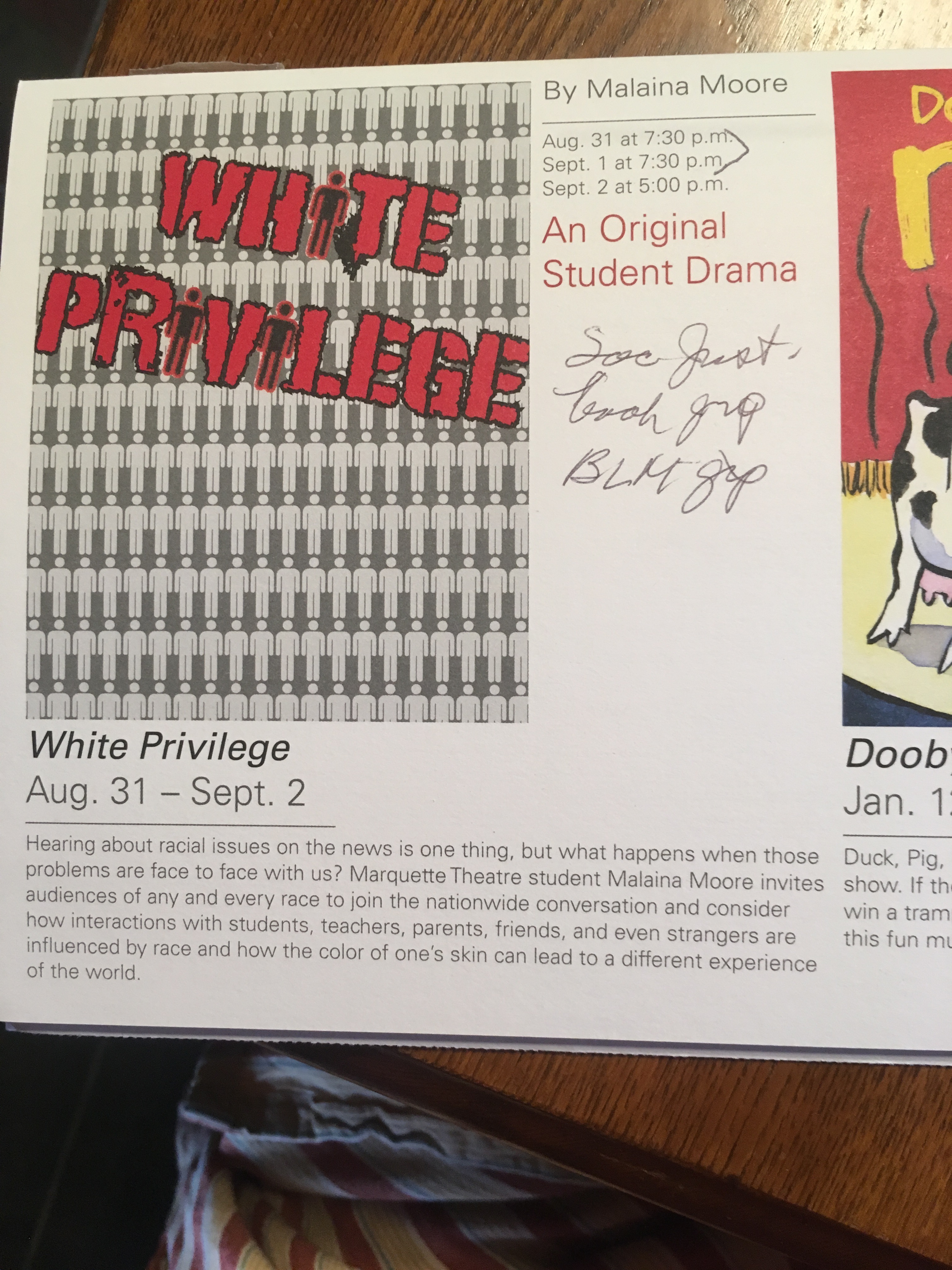 Sorry for the late announcement of a SPECIAL OPPORTUNITY to see a provocative play, “White Privilege”, written by a Marquette University student and performed by MU students THIS WEEKEND, Friday (7:30 pm), Saturday (7:30 pm) and Sunday (5:00 pm). Tickets are just $5.00 (!) and can be obtained via phone (414-288-7504) or purchase on-line at marquettetheatre.showclix.com . The Haelfer Theater is on campus at 1304 N. Clybourn St. See official info below and attached. Come AND invite others. We are going on Friday night.