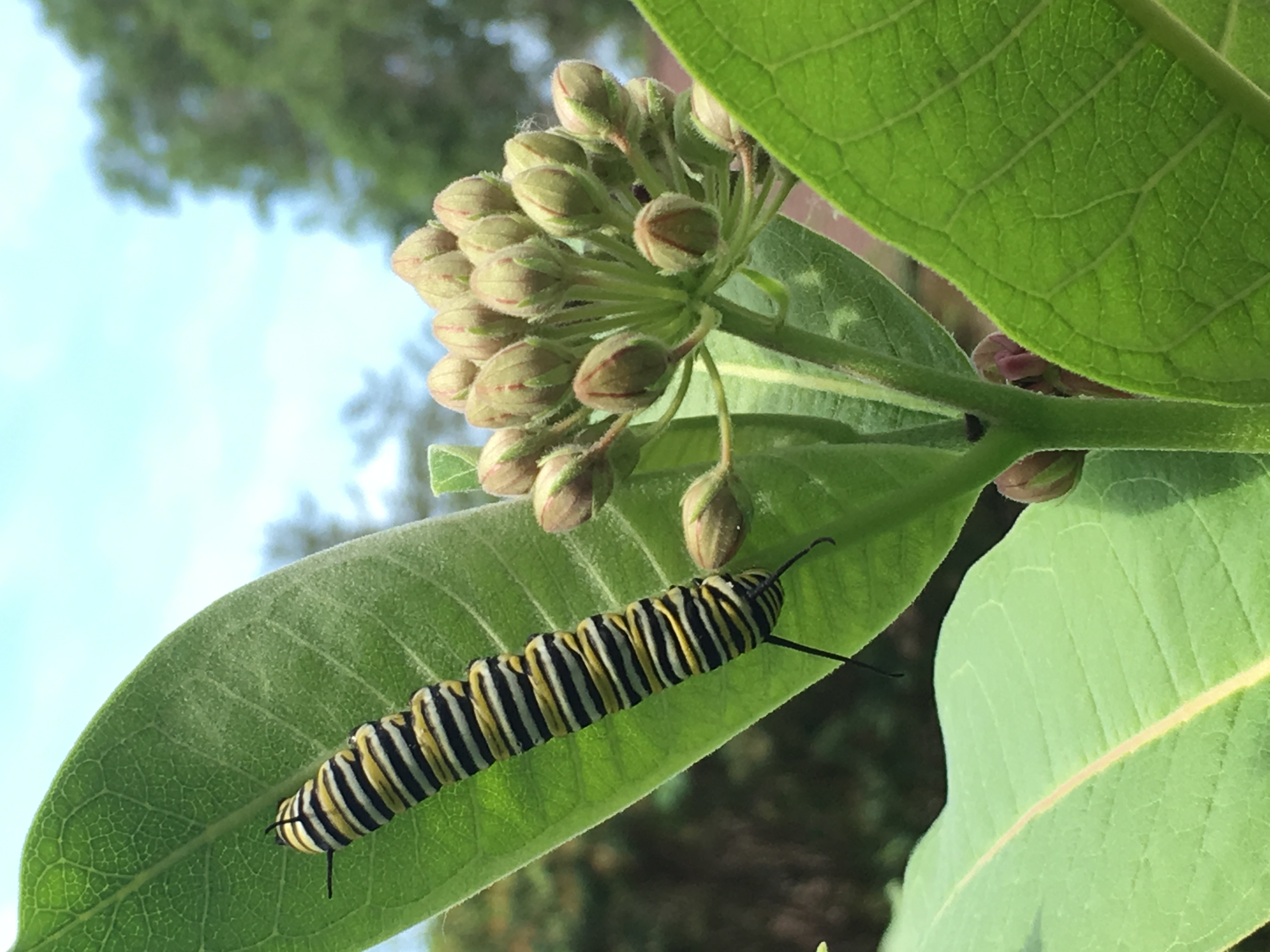 A beautiful monarch caterpillar feasting on milkweed in my yard. Hoping my new garden out front will feed many creatures and not look like a wild weed bed.