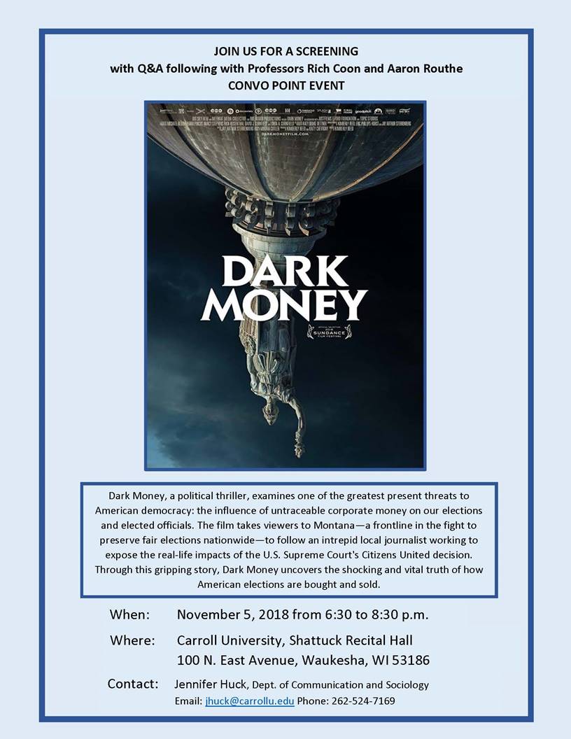 Good Morning! I know there was some interest among LeKooks in viewing the film Dark Money. I wanted to let you know it will be screened at Carroll on Monday night. The recital hall is a large enough venue that I’m sure members of the public would be welcome!
