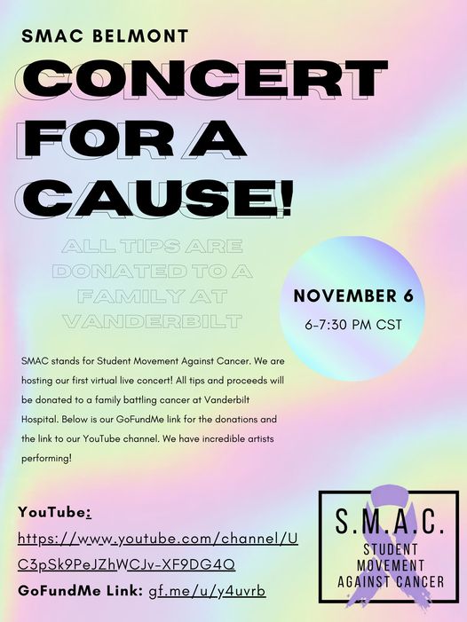 Attached and below is info re Bella's (our oldest granddaughter studying music @ Belmonte U in Nashville) planned "Concert for a Cause" to support prevention/treatment of CANCER. Taking place this Friday. Try to link in a little if possible. Hopefully she'll be singing, too.